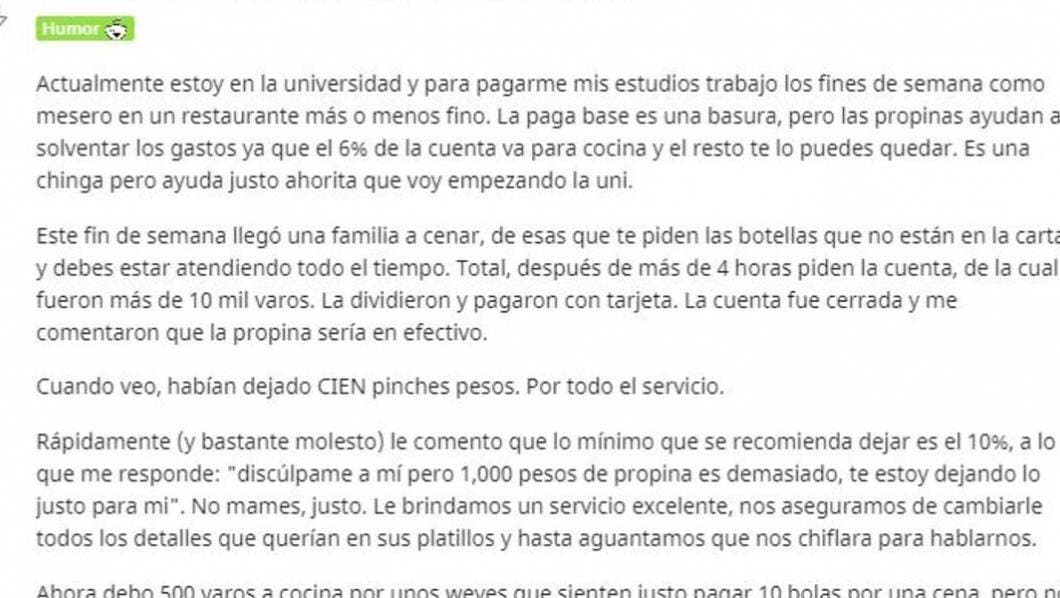 “Después de más de 4 horas piden la cuenta, de la cual fueron más de 10 mil varos. La dividieron y pagaron con tarjeta. La cuenta fue cerrada y me comentaron que la propina sería en efectivo. Cuando veo, habían dejado CIEN pinches pesos. Por todo el servicio”, comentó el mesero en Reddit.