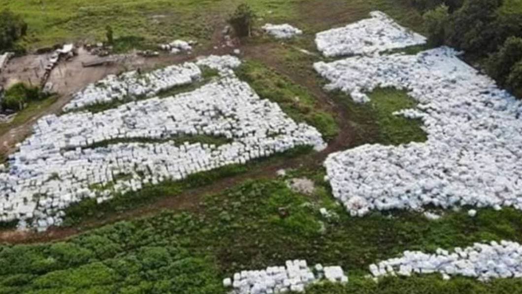 Imágenes aéreas tomadas por la agencia de noticias AFP muestran un mar de cajas con botellas con agua tiradas en el campo de la que parece ser una finca privada en el barrio Higuillar en el municipio de Dorado, a 40 km al oeste de San Juan.