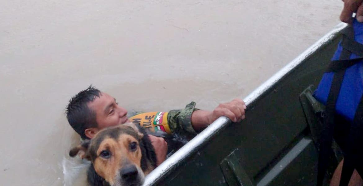 La imagen, que circula por Twitter, muestra a un valiente soldado portando un brazalete que lo identifica como integrante del Plan DN-III-E subiendo a una lancha a un perro que estaba en el agua, la mirada del animalito mostraba emoción por subir a la lancha.