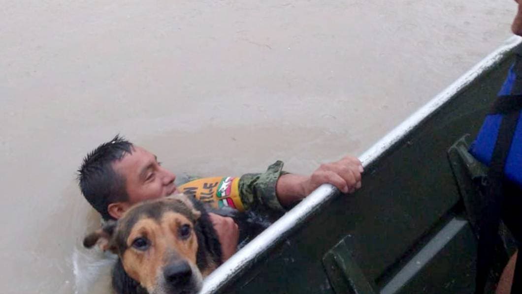 La imagen muestra como el soldado salva a un perro de ahogarse en las inundaciones que afectaron a Reynosa tras el paso del huracán "Hanna".