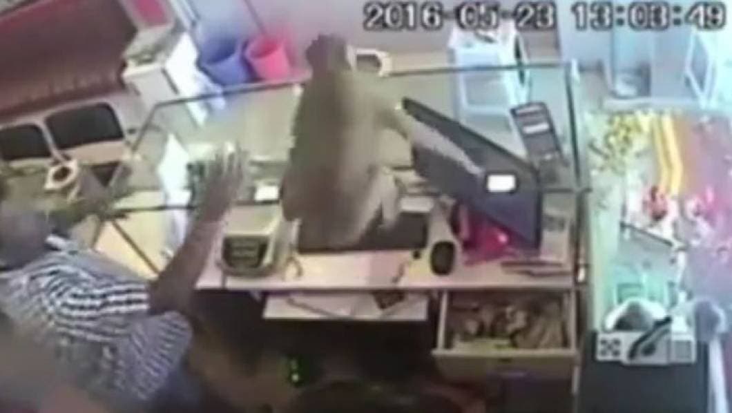 En un video que se hizo viral en YouTube, se muestra al mono intentar recuperar su guayaba y cuando le abren para regresársela, aprovechó para lanzarse contra el empleado y enseguida se sube al mostrador, abre el cajón donde está el dinero y rápidamente toma 150 dólares.