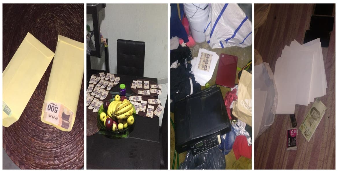 Durante la detención de las nueve personas, en los siete cateos, fue también asegurado, papel moneda falso de diferentes denominaciones entre las que destaca mil, 500 y 200 pesos, impresoras, placas de serigrafía, consumibles para impresión, hilos 3D para billetes de 500 pesos, guillotinas de corte, papel para impresión, hojas impresas, trituradoras de papel, computadoras, tabletas electrónicas, dispositivos USB, discos compactos, documentación diversa, teléfonos celulares, armas cortas y largas, así como estupefaciente.
