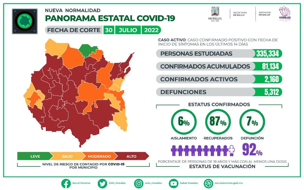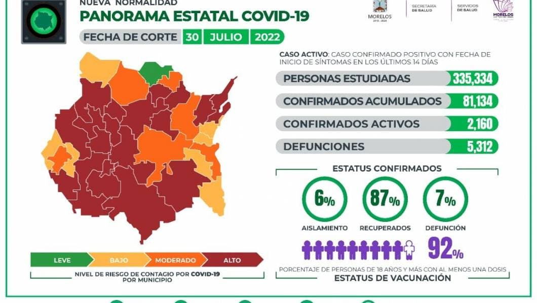 La Secretaría de Salud informa que a la fecha en Morelos se han estudiado 335 mil 334 personas, de las cuales se han confirmado 81 mil 134 con coronavirus COVID-19; 2 mil 160 están activas y se han registrado 5 mil 312 defunciones.