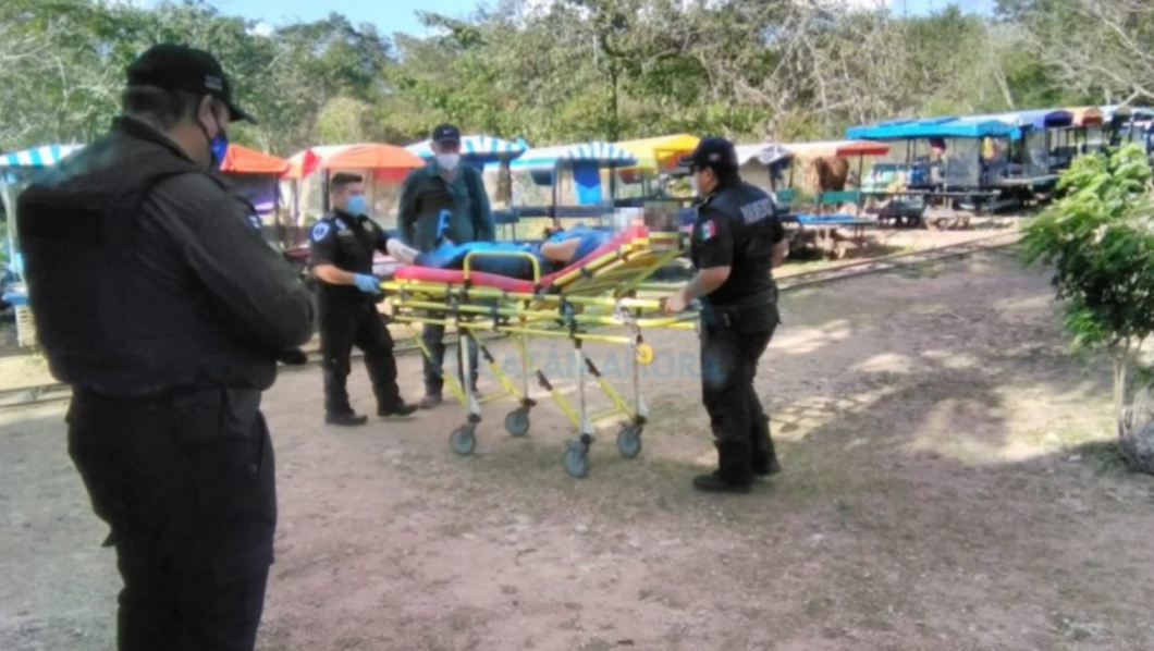 Resulta que la turista resultó lesionada y terminó en el hospital al recibir una patada de un caballo que remolcaba un truck (una especie de carreta jalada por un equino), ayer por la tarde en el parador turístico “Los Cenotes De Cuzama”.
