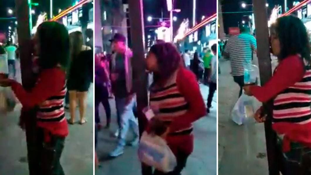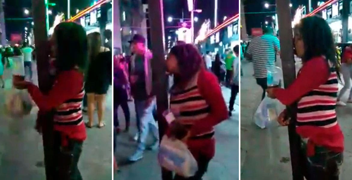 La chica todavía traía una bebida en la mano cuando fue grabada besando de lengua y sin pena alguna al poste de luz.