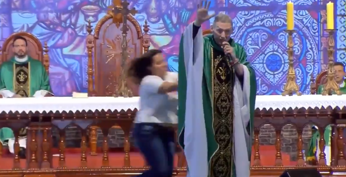 El sacerdote estaba orando, cuando la mujer subió al escenario y lo empujó.