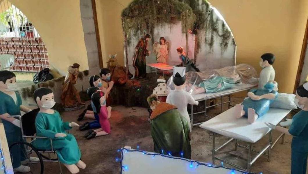 En lugar de los tradicionales animalitos y pastores que suelen colocarse en los nacimientos, la parroquia decidió representar la atención que se le da a los pacientes con coronavirus.