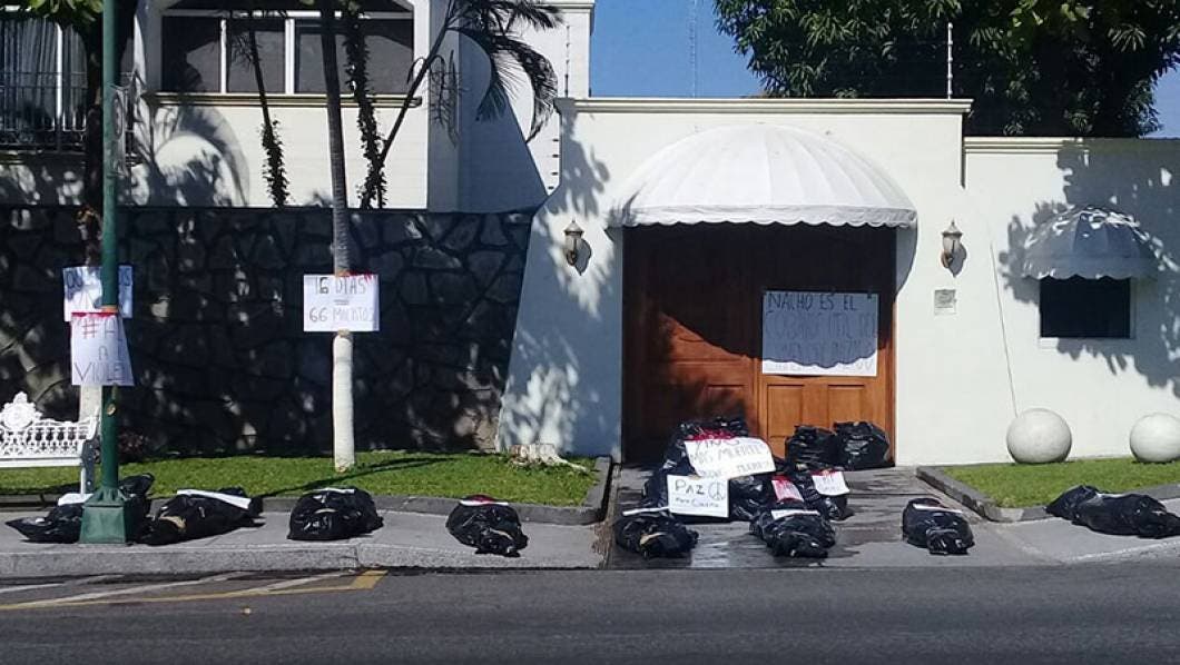 En el lugar, la delegada dejó algunas bolsas negras de plástico que simulaban ser cuerpos envueltos en este material, además de teñir algunas partes con pintura roja para simular sangre.