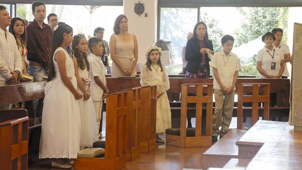 Portando hermosos accesorios como coronas de flores y medallas, así como lindos vestidos las niñas, estudiantes de diversos colegios realizaron su Primera Comunión en la Parroquia Madre de la Misericordia.