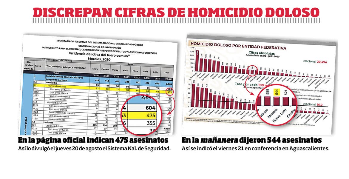 Respecto del Estado de Morelos, se informó líneas arriba que el viernes 21 se reportaron 544 homicidios dolosos entre el 1 de enero y el 31 julio de este año, pero en la víspera el documento oficial anotó 475; lo que abre una incógnita de la omisión de 69 asesinatos o el exceso de la misma cifra de ese tipo de delito.