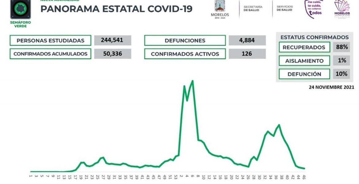 La Secretaría de Salud informa que a la fecha en Morelos se han estudiado 244 mil 541 personas, de las cuales se han confirmado 50 mil 336 con coronavirus COVID-19; 126 están activas y se han registrado 4 mil 884 defunciones.