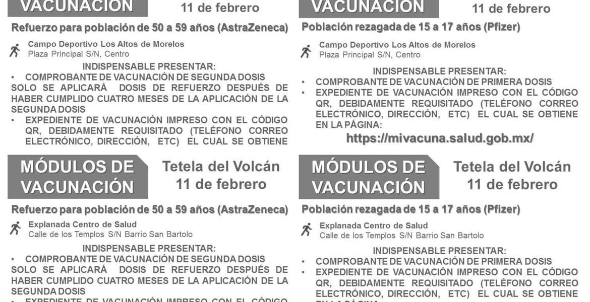 Esta tarde se dieron a conocer las fechas para la vacunación de dosis de refuerzo para adultos de 50 a 59 años que viven en Ocuituco y Tetela del Volcán.