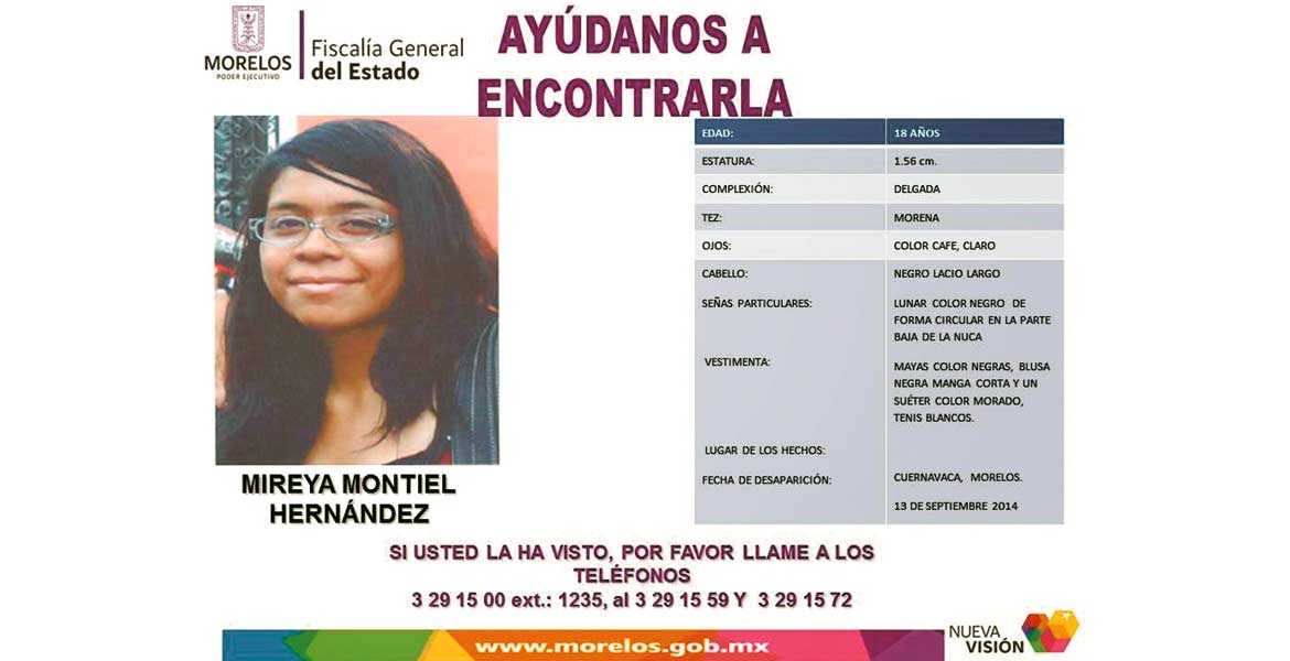 A través del Diario Oficial de la Federación la PGR dio a conocer este acuerdo, ya que a pesar de las diligencias no se ha podido localizar a Mireya Montiel Hernández, quien el 13 de septiembre del 2013 estaba en su domicilio y desde ese momento su familia no tiene datos de la joven.