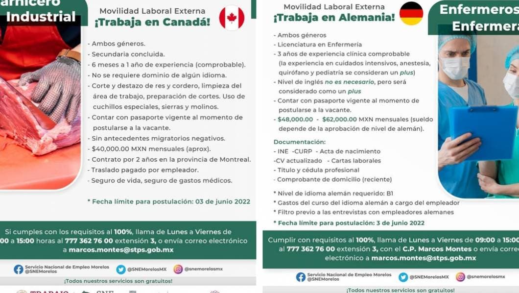 De esta manera, el SNE Morelos, mediante el “Mecanismo de Movilidad Externa”, invita a la población a conocer el Mecanismo de Movilidad Externa que permite la vinculación laboral en el extranjero, en esta ocasión por medio de dos convocatorias vigentes.