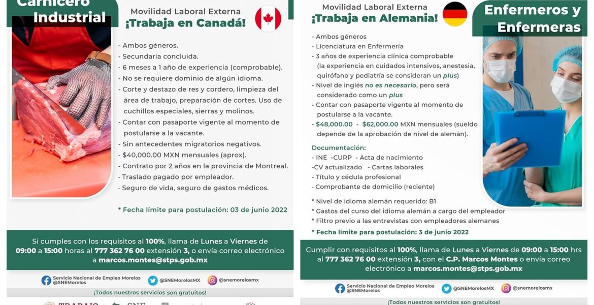 De esta manera, el SNE Morelos, mediante el “Mecanismo de Movilidad Externa”, invita a la población a conocer el Mecanismo de Movilidad Externa que permite la vinculación laboral en el extranjero, en esta ocasión por medio de dos convocatorias vigentes.