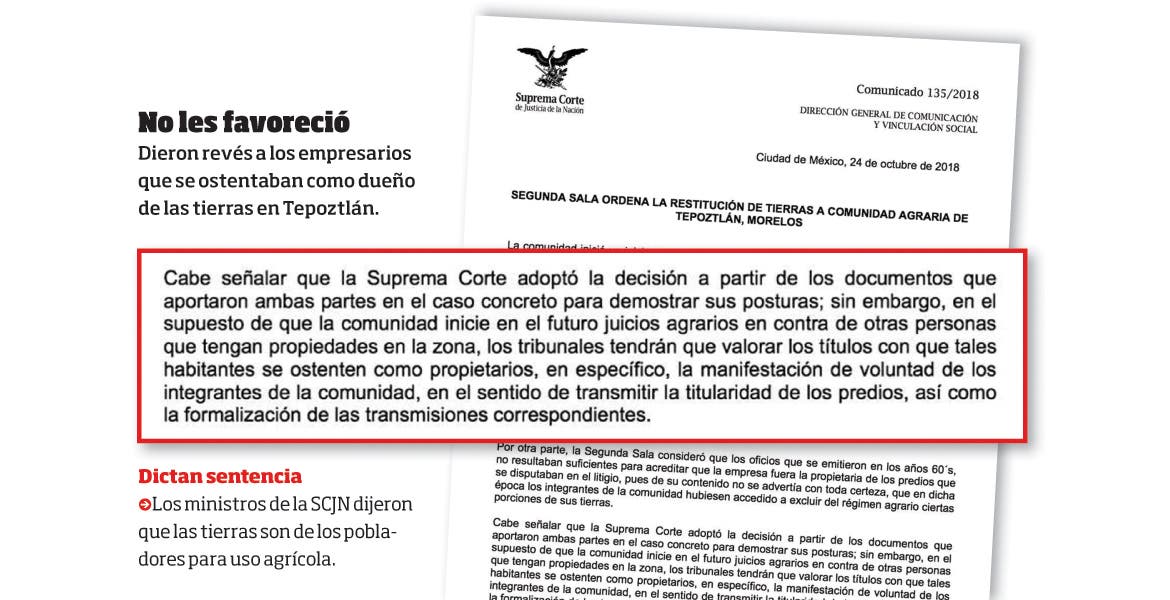 Ciudad de México.- Después de casi 20 años de conflicto, ministros de la Segunda Sala de la Suprema Corte de Justicia de la Nación (SCJN) dictaron sentencia definitiva para solucionar el conflicto por el proyecto de construir un club de golf en Tepoztlán; ordenaron restituir las tierras a pobladores.