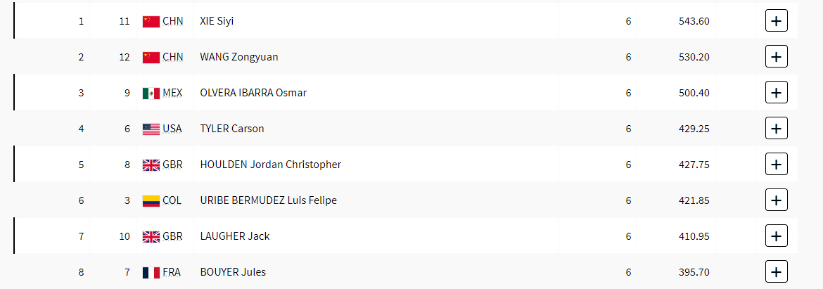 En el segundo y primer lugar se encuentran respectivamente Xie Siyl y Wang Zongyuan con 530.20 y 543.60 puntos.
