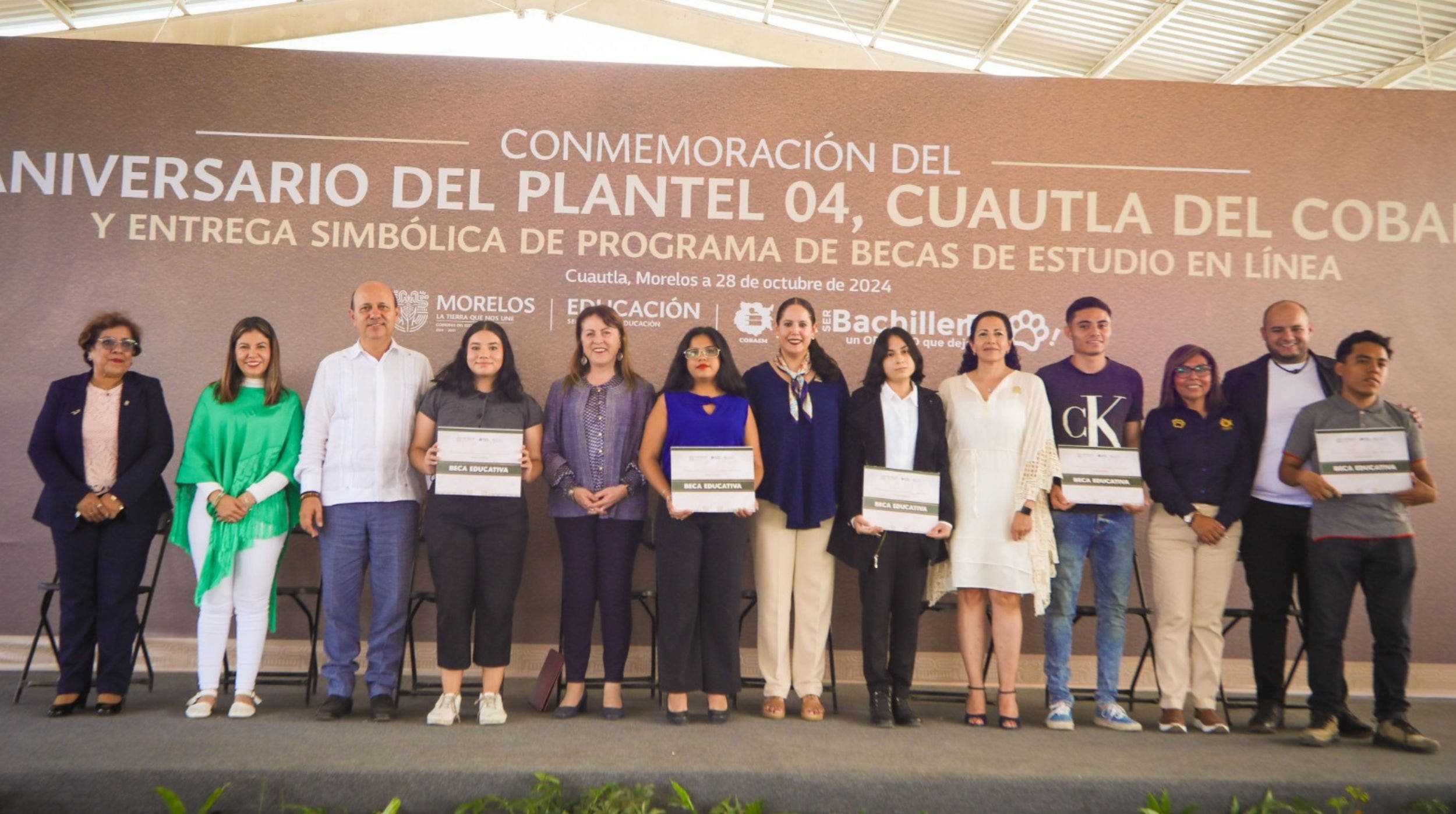 Durante la celebración del 35 aniversario del plantel 04 del Colegio de Bachilleres del Estado de Morelos (Cobaem), en Cuautla, la gobernadora Margarita González Saravia entregó las primeras 5 becas a jóvenes que adquirieron conocimientos de manera autodidacta y cuentan con experiencia laboral, para que accedan a un título profesional.