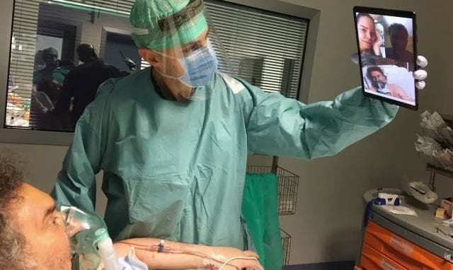 Un anciano postrado en una cama sostiene una tablet frente a su rostro mientras respira con dificultad. Uno de los médicos del hospital donde está internado lo ayuda a contactarse con uno de sus familiares por medio de una videollamada que, posiblemente, sea la última que haga.