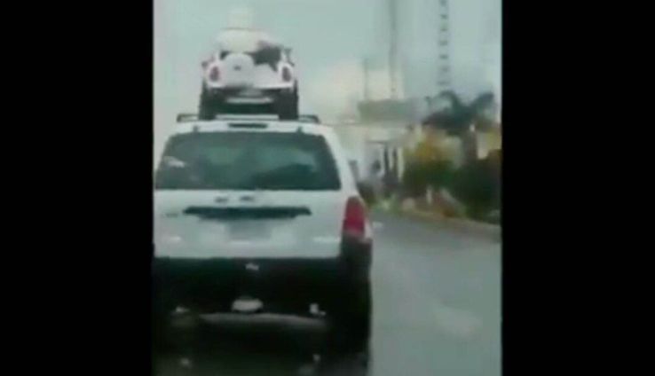 En las imágenes se puede ver cómo dos menores se encuentran encima de un auto eléctrico de juguete, mismo que estaba amarrado al techo del vehículo.