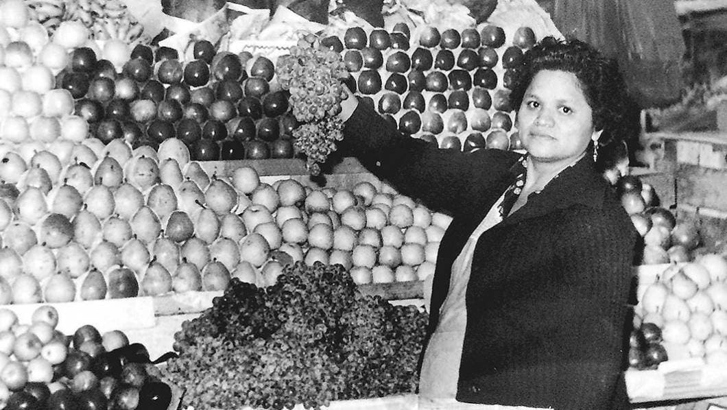 La señora Reyna Álvarez Rivas en su puesto de frutas y verduras en el mercado Adolfo López Mateos; Doña Reyna fue de las fundadoras del centro de abasto; hoy, después de 50 años, Don Serafín Barrera Álvarez, hijo de la señora Reyna, es el que atiende el puesto al cual llegó con sus padres a los seis años.