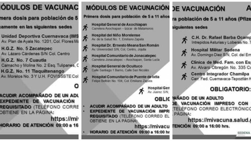 Te compartimos las sedes para la vacunación de niños de 5 a 11 años vs COVID19 en Morelos. Será a partir del lunes 4 de julio.
