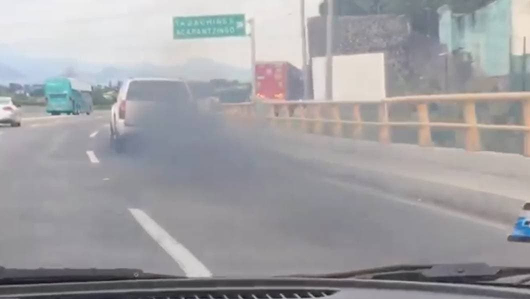 Camioneta circula con avería mecánica en el Paso Express, dejando Estela de humo negro a su paso, dificultando la vista a conductores cercanos, tome precauciones. Además, circulaba sin placas