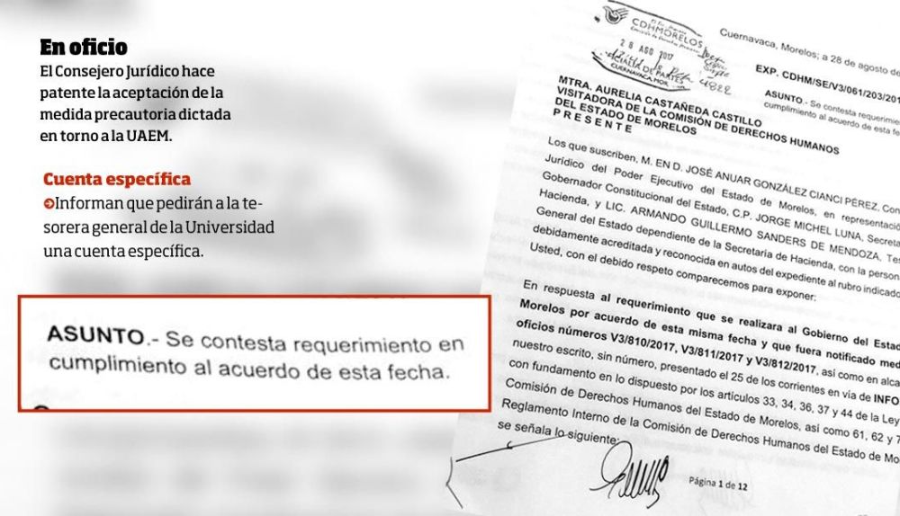 CUERNAVACA, MORELOS.- El Gobierno del Estado acepta la propuesta de la Comisión de Derechos Humanos del Estado de Morelos (CDHM) para encontrar una solución expedita al pago de los trabajadores de la Universidad Autónoma del Estado de Morelos (UAEM), la cual consiste en pedir a la tesorera de esta institución Margarita Leticia Robledo Pedroza, designe una cuenta específica para el depósito de los recursos pactados con la Secretaría de Educación Pública (SEP) y la administración estatal.
