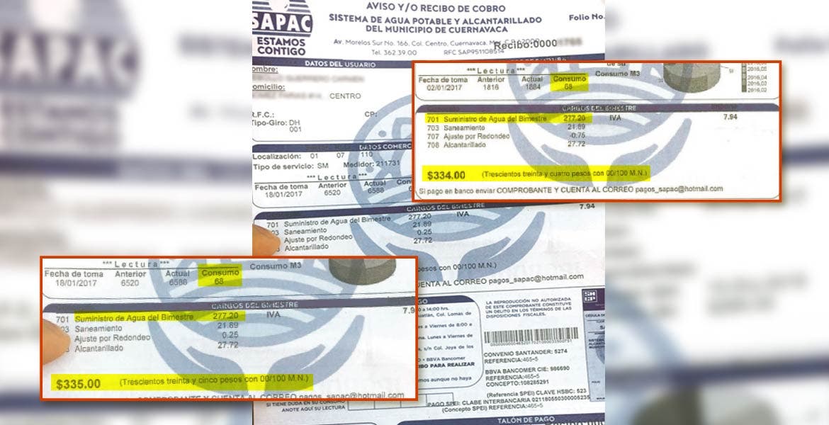 Cuernavaca, MORELOS.- Vecinos de la colonia Centro del municipio de Cuernavaca, solicitaron la intervención de Diario de Morelos (DDM) para que se atendiera su denuncia en relación con la variación de la tarifa de agua potable que detectaron en este primer mes de 2017, pues aseguran que el recibo llegó con un diferencial considerable tanto en la tarifa como en la cantidad de metros cúbicos de agua consumidos en comparación con el año pasado.