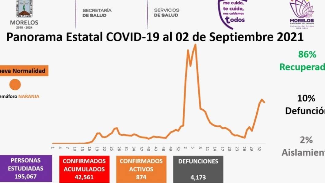 La Secretaría de Salud informa que a la fecha en Morelos se han estudiado 195 mil 067 personas, de las cuales se han confirmado 42 mil 561 con coronavirus COVID-19; 874 están activas y se han registrado 4 mil 173 defunciones.