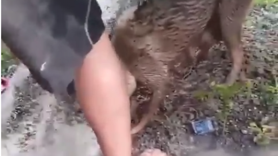 Una perra junto a una persona suman esfuerzos para rescatar a uno de sus cachorros de morir ahogado.