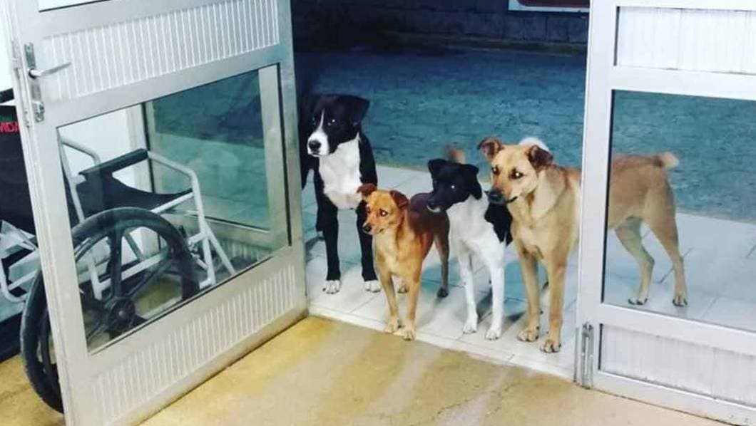 La usuaria de Facebook Cris Mamprim subió a su cuenta la fotografía de cuatro perros esperando a su humano, una persona en condiciones de calle, que ingresó a urgencias.