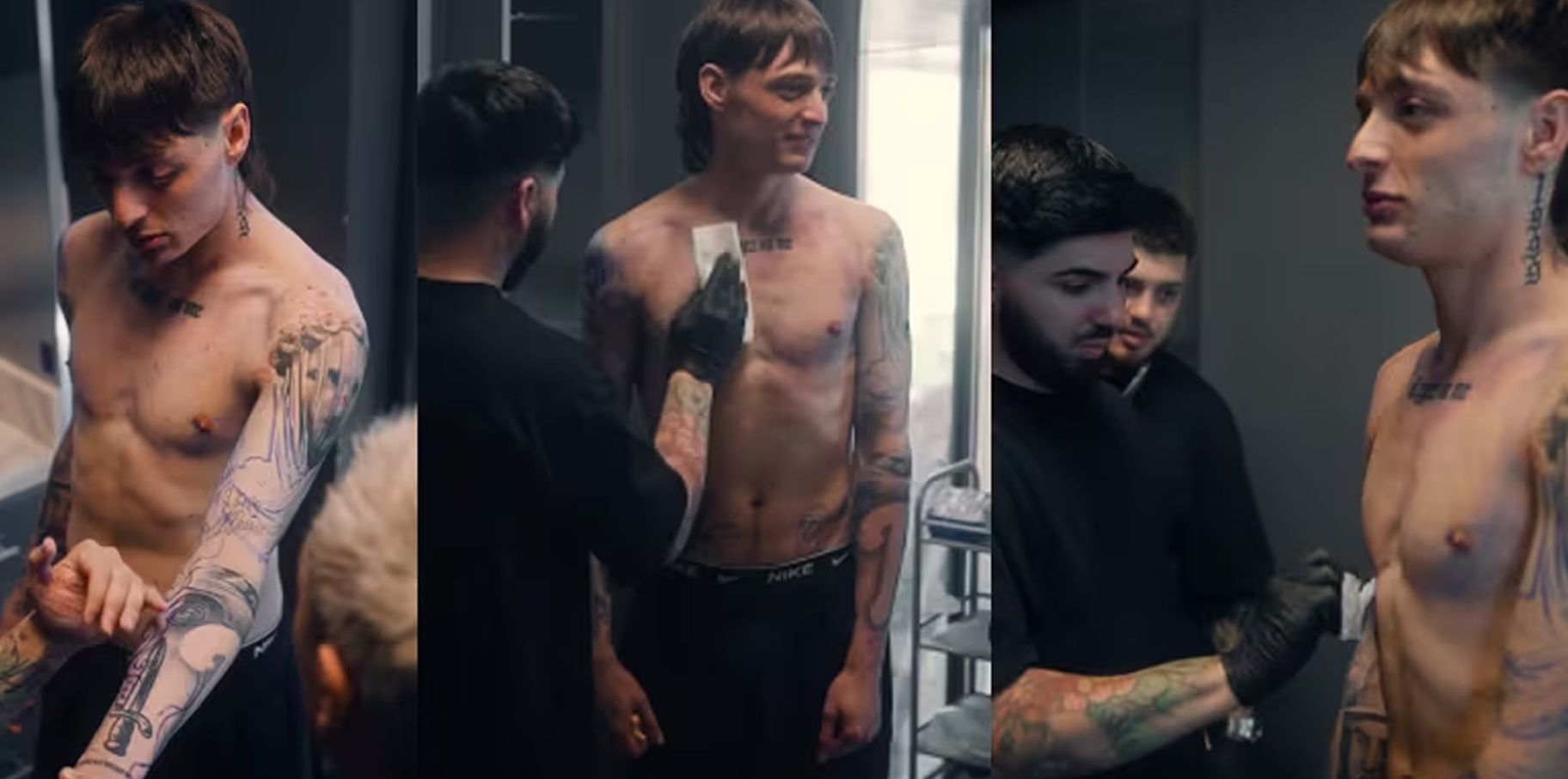 Previo a la sesión de tatuajes, el cantante mostró sus extremidades para que los artistas pudieran planificar y colocar los diseños de manera adecuada. Además, se mostraron imágenes de una sala que semejaba un quirófano, así como la colocación de una canalización intravenosa, indicando el proceso médico previo al inicio de la sesión de tatuajes.