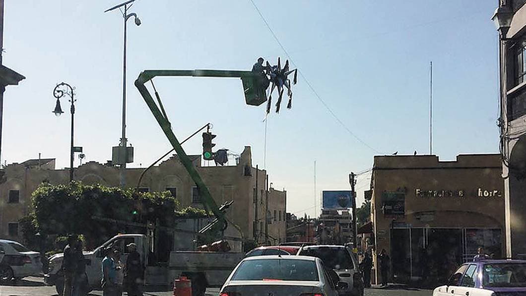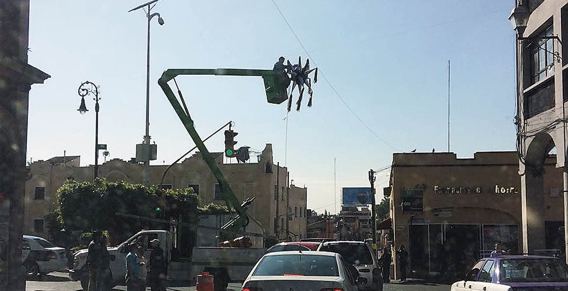Previo a los festejos de Navidad 2016, las calles del centro de Cuernavaca son decoradas con las tradicionales piñatas de siete picos; en la gráfica superior una es colocada en el cruce de las calles Hidalgo y Galeana.