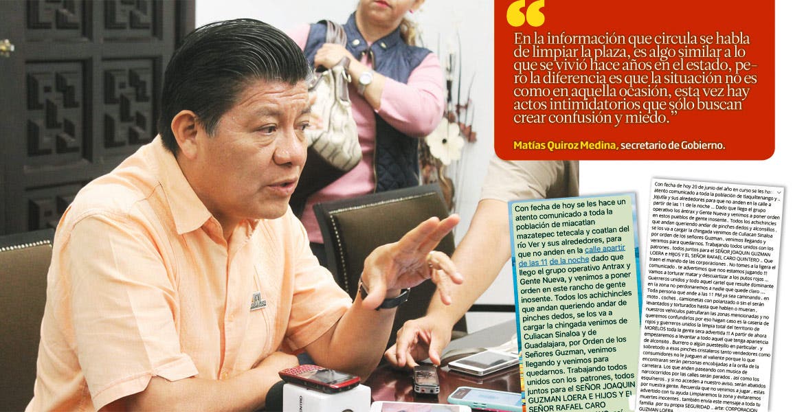 En la información que circula se habla de limpiar la plaza, es algo similar a lo que se vivió hace años en el estado, pero la diferencia es que la situación no es como en aquella ocasión, esta vez hay actos intimidatorios que sólo buscan crear confusión y miedo." Matías Quiroz Medina, secretario de Gobierno.