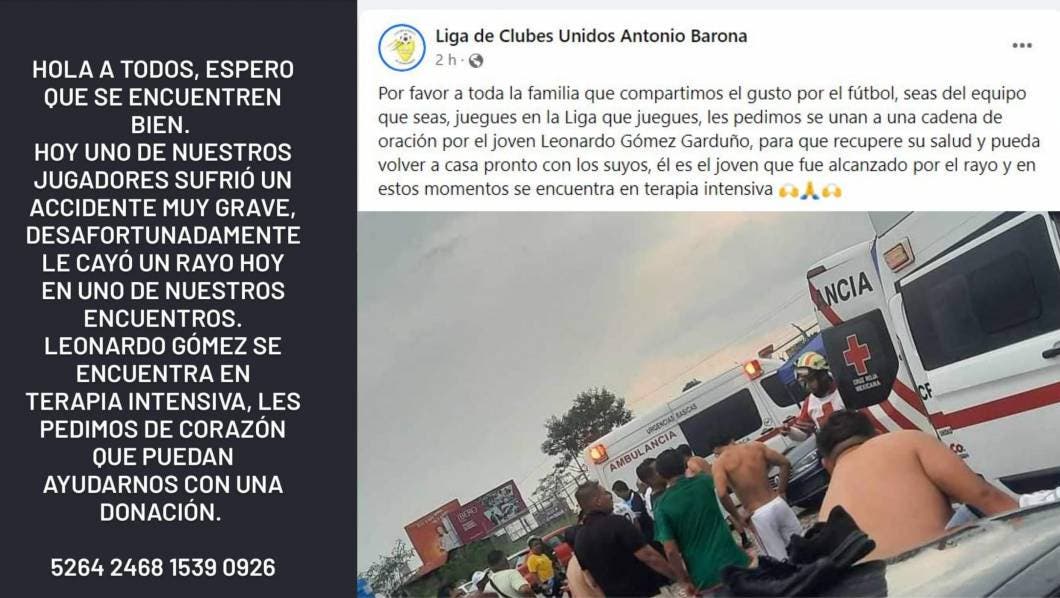 "Por favor a toda la familia que compartimos el gusto por el futbol, seas del equipo que seas, juegues en la Liga que juegues, les pedimos se unan a una cadena de oración por el joven Leonardo Gómez Garduño, para que recupere su salud y pueda volver a casa pronto con los suyos, él es el joven que fue alcanzado por el rayo y en estos momentos se encuentra en terapia intensiva", dice una publicación en Facebook.