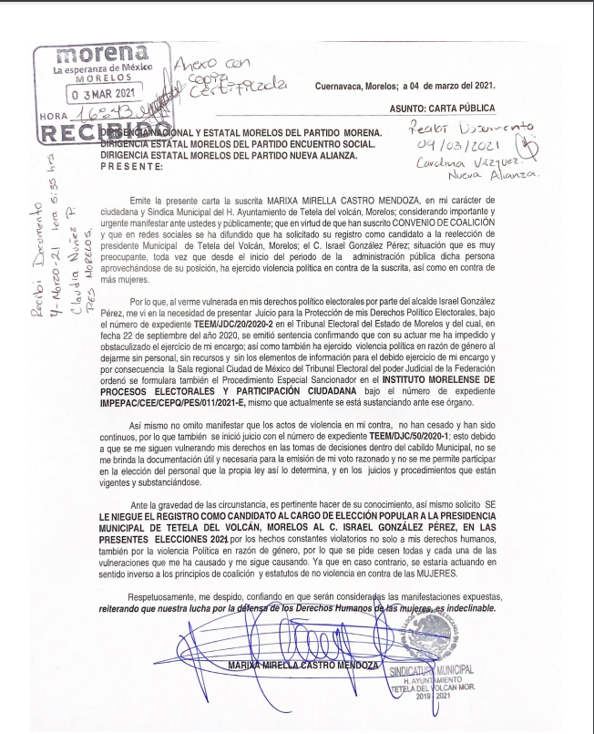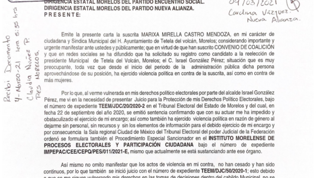 Hace un par de días, la ofendida remitió un escrito dirigido a las dirigencias nacional y estatal de Morena, así como de los partido Encuentro Social y Nueva Alianza, donde describió la serie de agresiones de que ha sido víctima por parte de González Pérez.