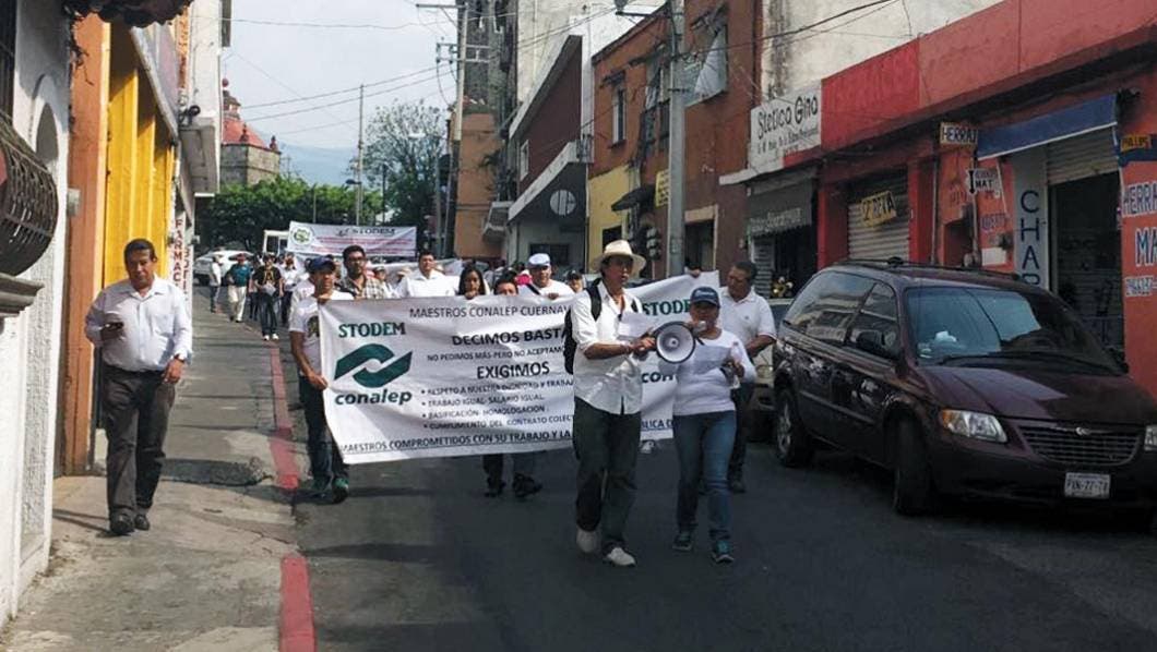 CUERNAVACA, MORELOS.- Integrantes del Sindicato de Trabajadores de Organismos Descentralizados Estatal y Municipales del Estado de Morelos (STODEM) del Colegio Nacional de Educación Profesional Técnica (Conalep) Morelos, marcharon en demanda de respuesta a sus peticiones como basificación y seguridad social.