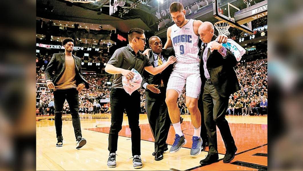 Vucevic se lesionó cuando restaban 5:29 en el segundo cuarto del juego contra los vigentes campeones de la NBA; tuvo que usar muletas para retirarse.