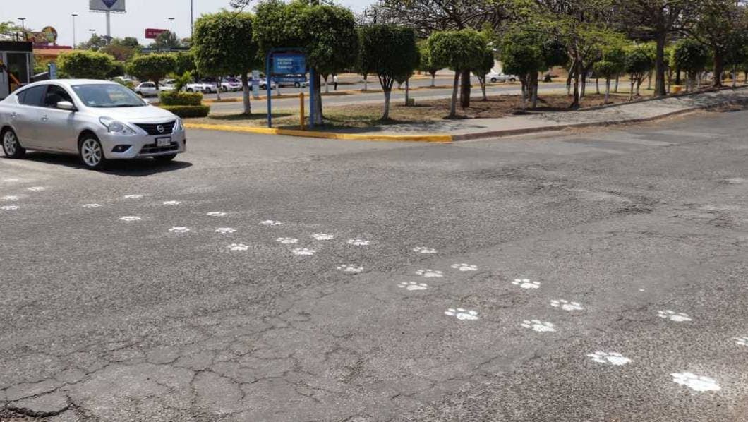 En la calle Escuadrón 201, del municipio de Cuernavaca, frente a un conocido centro comercial de Lomas de la Selva, por iniciativa de una ciudadana se realizó la pinta de huellitas de perro, con la finalidad de que los automovilistas tengan precaución a la hora de que vean cruzando personas con sus mascotas y no haya accidentes. Los mismo igual para los peatones, para que tengan cuidado al cruzar.