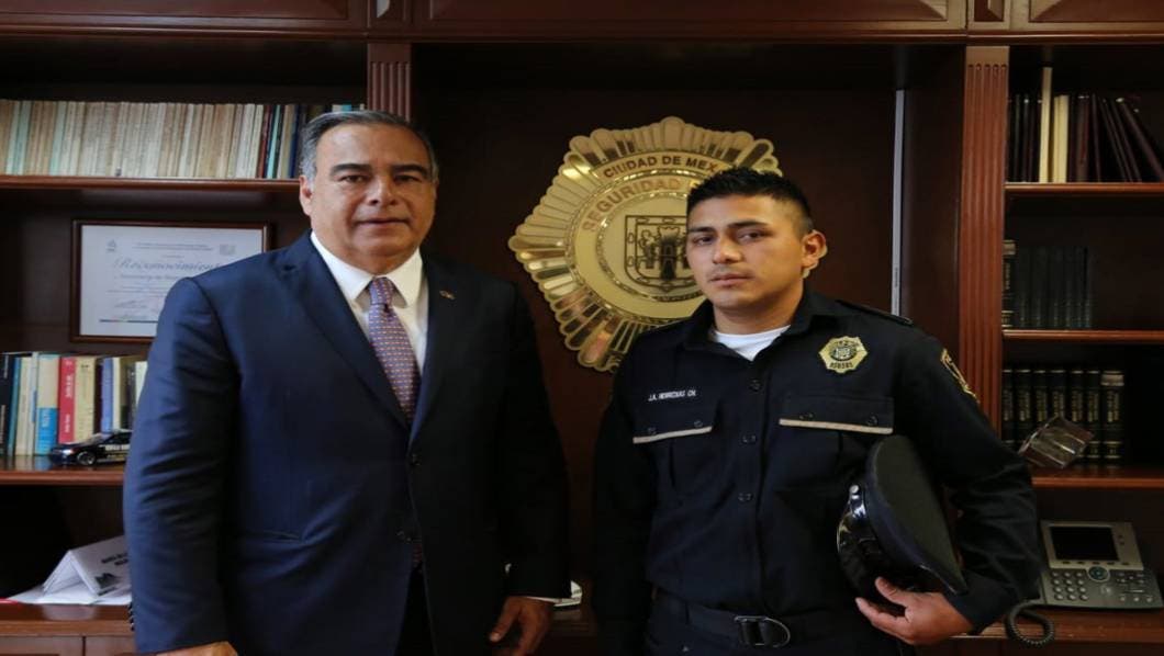 El oficial José Armando Herredias Sánchez, de la Secretaría de Seguridad Pública de la Ciudad de México, se hizo acreedor a un ascenso inmediato instruido por el titular de la dependencia, ingeniero Raymundo Collins Flores, quien lo recibió para reconocer su valor y por defender a la ciudadanía ante un hecho delictivo