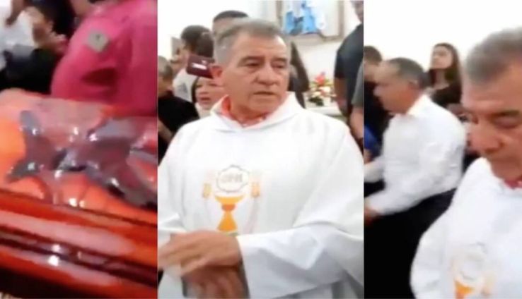 En un video, que se ha viralizado, se oye cómo el cura trata de explicar que el féretro no puede permanecer adentro de la iglesia por el grado de descomposición del cuerpo, cuando es interrumpido con un empujón y los gritos de mujeres, quienes le solicitan la bendición.