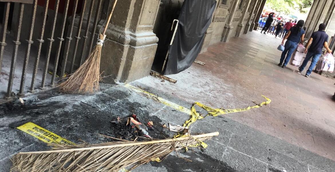 Integrantes de organizaciones campesinas vandalizaron esta tarde la entrada de Palacio de Gobierno y prendieron fogatas en el lugar.