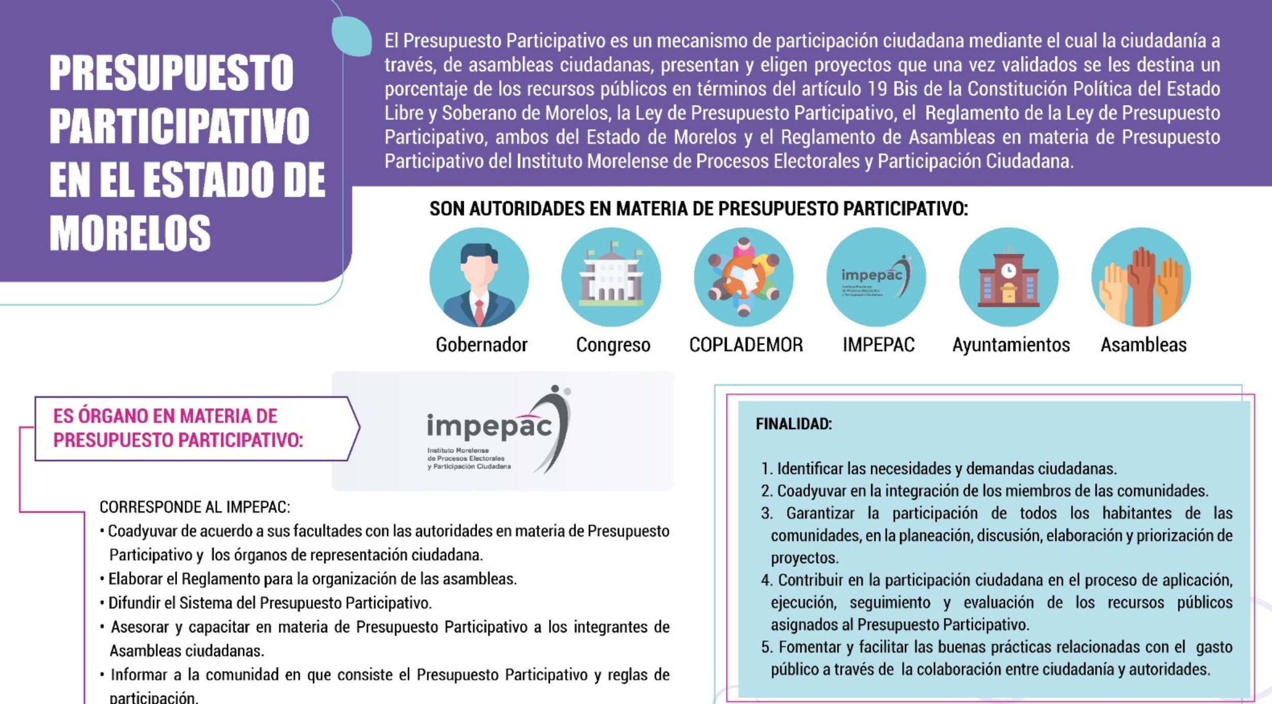 El 85 por ciento del Presupuesto de Egresos del Estado de Morelos o de los municipios deberá ejercerse a través del Presupuesto Participativo, así lo establece la nueva Ley de Participación Ciudadana del Estado de Morelos.