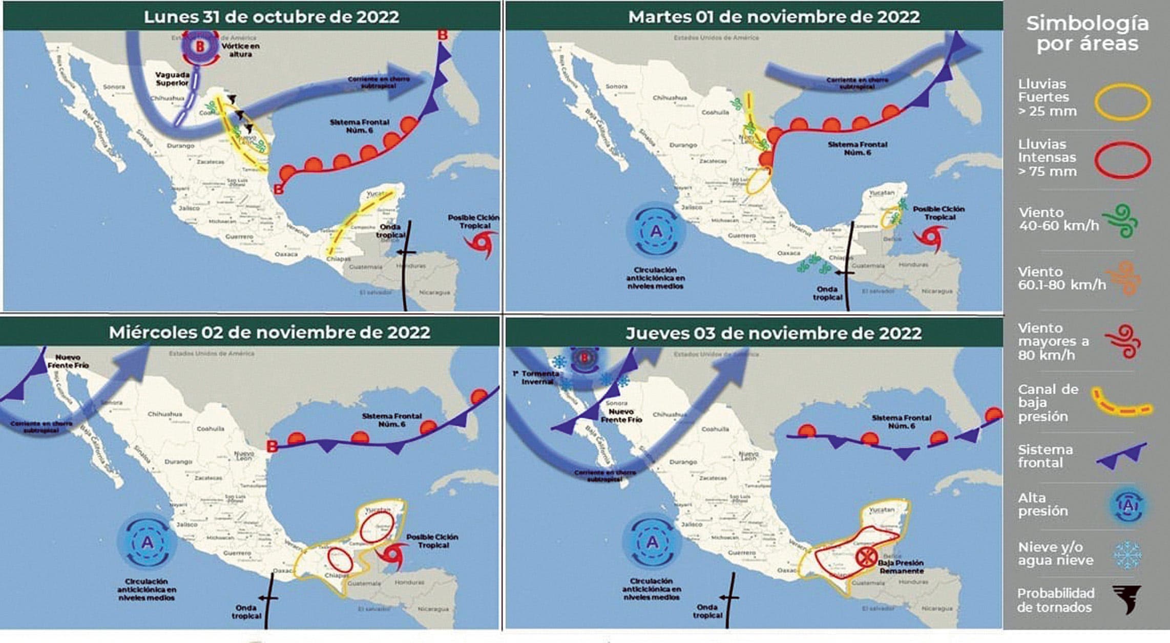 Debido al sistema de alta presión sobre la mayor parte del territorio nacional, favorecerá tiempo estable con bajo potencial de lluvias en la mayoría de los estados, sin descartar tormentas vespertinas aisladas en estados del centro y sureste.