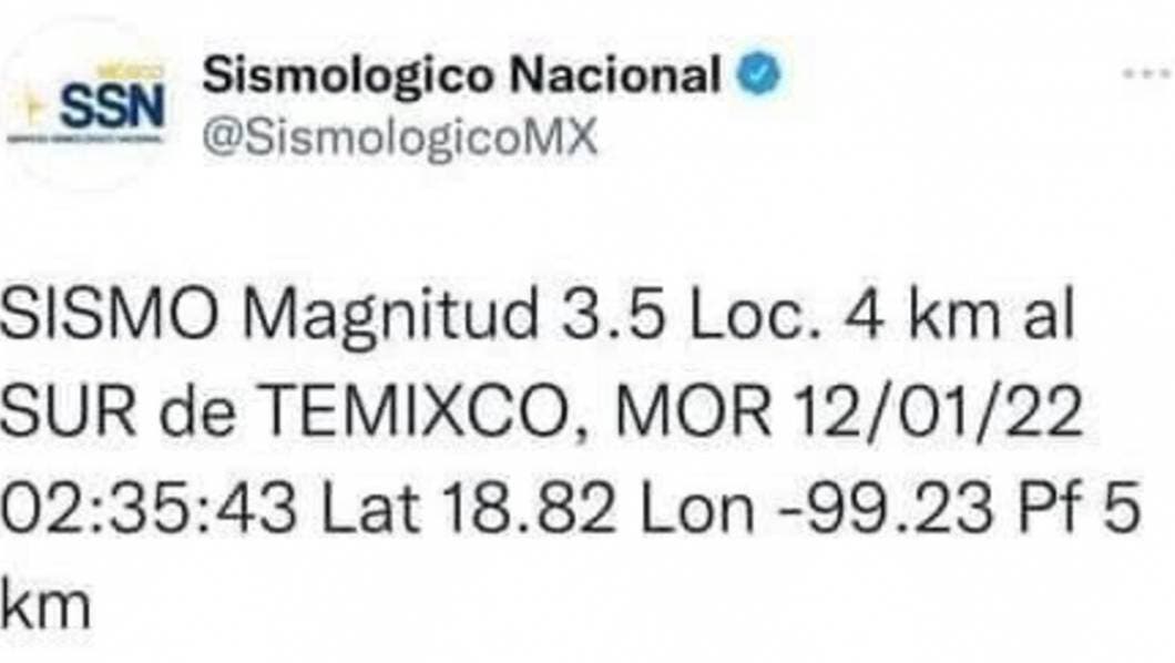"SISMO Magnitud 3.5 Loc. 4 km al SUR de TEMIXCO, MOR 12/01/22 02:35:43 Lat 18.82 Lon -99.23 Pf 5 km", escribió en Twitter el Sismológico.