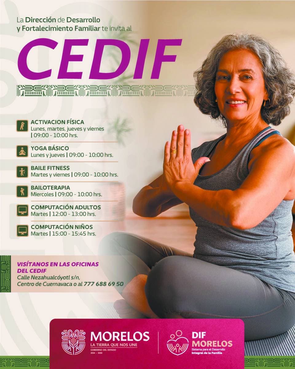 El CEDIF, en el Centro de Cuernavaca, imparte activación física, yoga básico, baile fitness, bailoterapia y computación para niños y adultos. En la Casa de Día Cuautla se brindan talleres para personas mayores de 60 años, entre ellos bisutería, computación, yoga, tejido, bordado, canto, pintura al óleo, invernadero y acondicionamiento físico. Las autoridades informaron que las personas interesadas pueden solicitar informes sobre inscripciones, horarios y requisitos en el Ceagem al 777 318 7656, CE DIF al 777 688 69 50 y Casa de Día Cuautla al 735 354 23 25, o acudir de manera presencial de lunes a viernes de 8:00 a 15:30 horas.