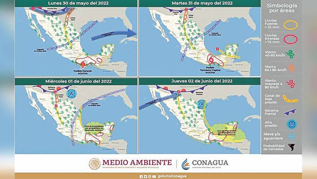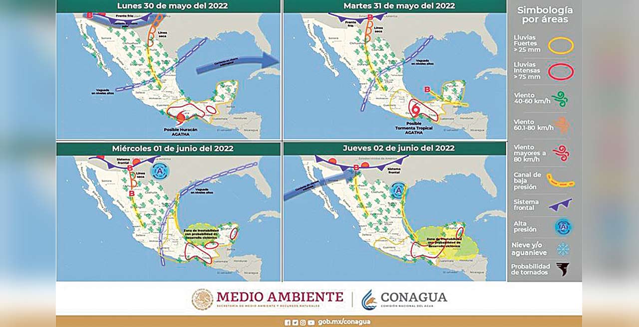 Cuernavaca.- La Comisión Estatal de Agua (Ceagua) informa que ante la presencia del ciclón tropical ‘Agatha’ en el Pacífico, se prevén lluvias y tormentas de moderadas a fuerte intensidad durante la primera semana del mes de junio.