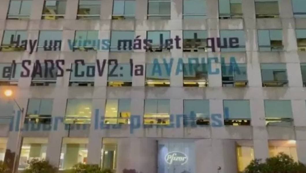 "Las vacunas contra la covid-19 deben ser un bien público de la humanidad ¡Liberen las patentes!", fue una de las frases que la organización proyectó con un haz de luz sobre el edificio de la empresa en el poniente de la capital mexicana.