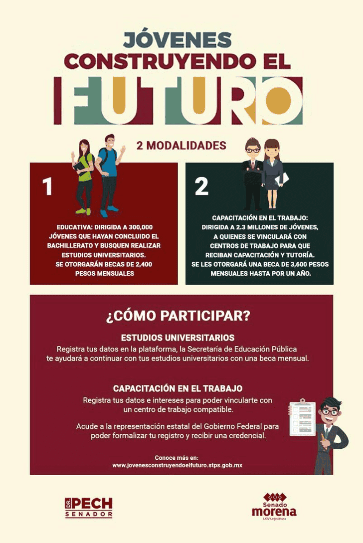 El programa dirigido a 2.3 millones de jóvenes es coordinado y operado por la Secretaría del Trabajo y Previsión Social (STPS), por medio del cual se vinculará a jóvenes con centros de trabajo para que reciban capacitación y tutoría. Durante su estancia se les otorgará una beca de 3 mil 600 pesos mensuales hasta por un año.